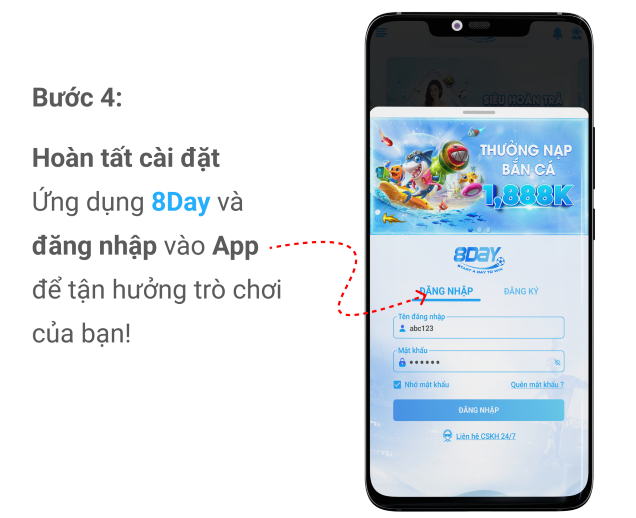 Buóc 4: Hoàn t?t cài ??t ?ng d?ng 8day và ??ng nh?p vào App ?? t?n h??ng trò ch?i c?a b?n